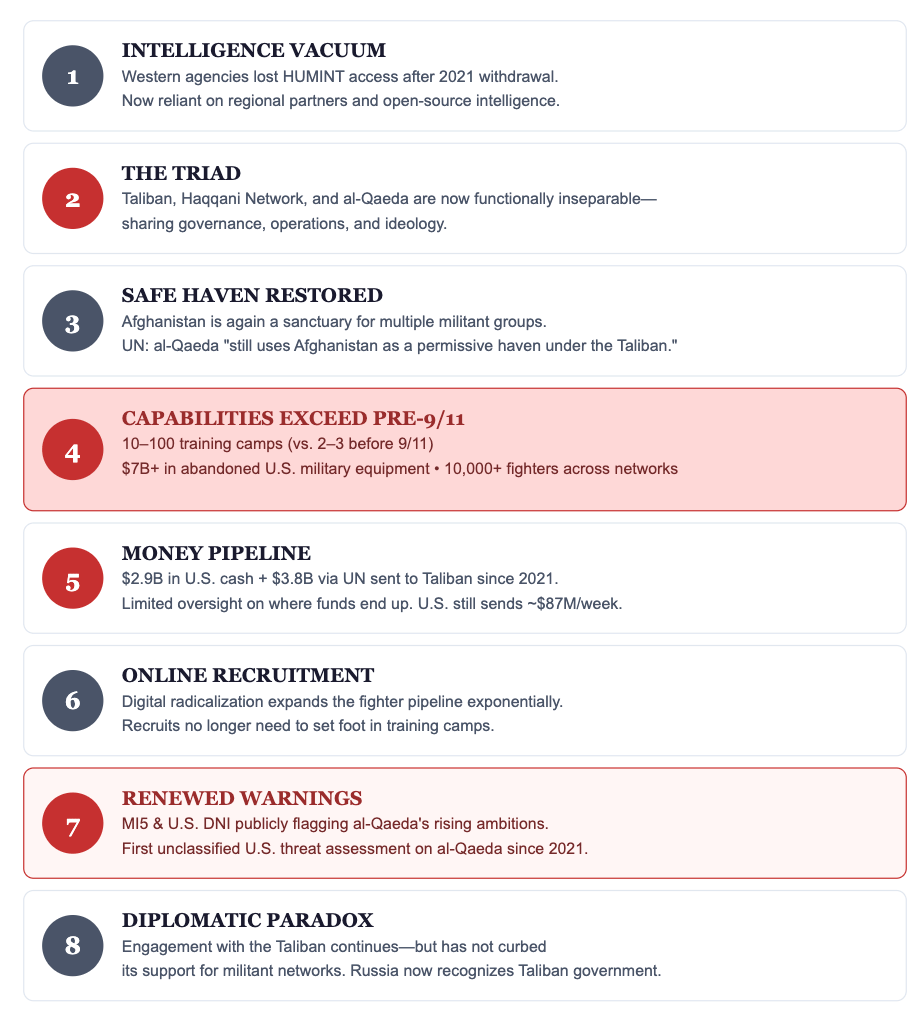 Editor's Note: Four years after the withdrawal from Afghanistan, the West's attention has shifted elsewhere—great power competition, Ukraine, the Middle East. But as Graham Aikin argues in this deeply sourced analysis, that pivot may have come at a cost. Al-Qaeda and its affiliates have quietly reconstituted under Taliban protection, operating from a network of training camps that arguably dwarfs anything that existed before 9/11. Billions in humanitarian aid flows into a system with little oversight, while fighters cycle through facilities built on the ruins of former CIA installations. U.S. and UK intelligence chiefs are now sounding the alarm publicly—a rare move that suggests the threat picture has changed. This is essential reading for anyone tracking the long-term trajectory of militancy in South Asia and beyond.